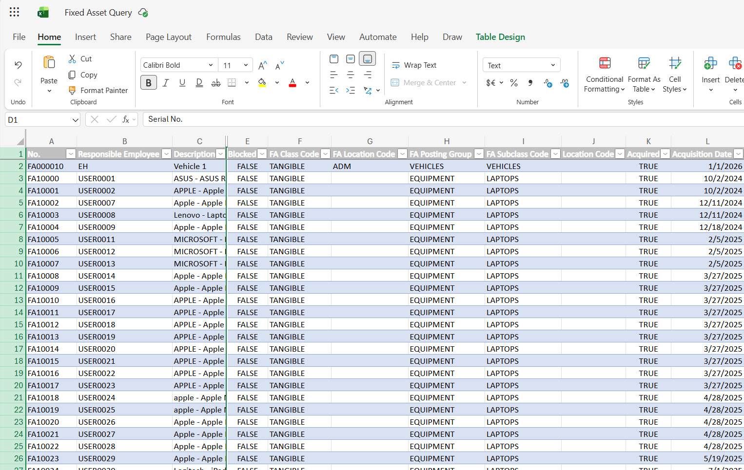 I have a list of our fixed assets in this workbook. I need you to analyze the data and organize all fixed assets by employee. For each employee, identify their laptop and phone, and check whether each device is at least 1 year old. If a device is 1+ years old, propose a replacement model.